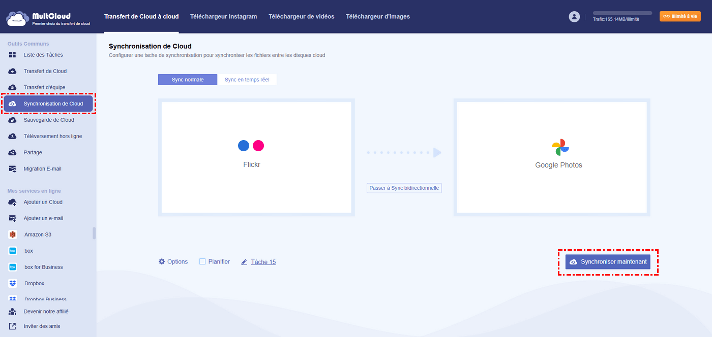 Si vous souhaitez déplacer des dossiers ou l'intégralité du stockage Flickr vers Google Photos, vous pouvez utiliser la fonctionnalité « Synchronisation de Cloud » pour synchroniser vos photos de Flickr vers Google Photos.