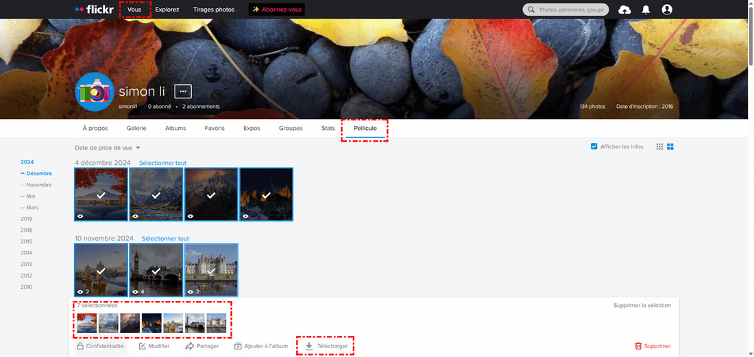 - Télécharger des photos depuis Flickr : Appuyez sur « Vous » > « Albums », « Pellicule » ou toute autre option contenant vos photos. Cochez toutes les photos à télécharger, puis appuyez sur « Télécharger ».