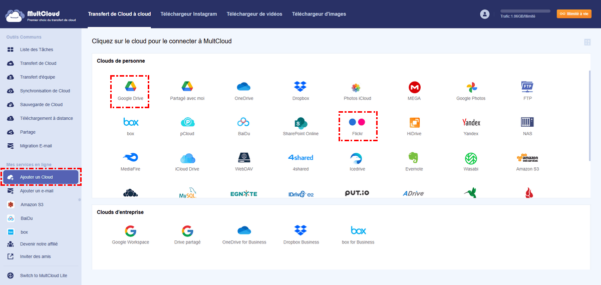 Étape 2. Ajoutez les clouds (Google Drive et Flickr) à MultCloud.