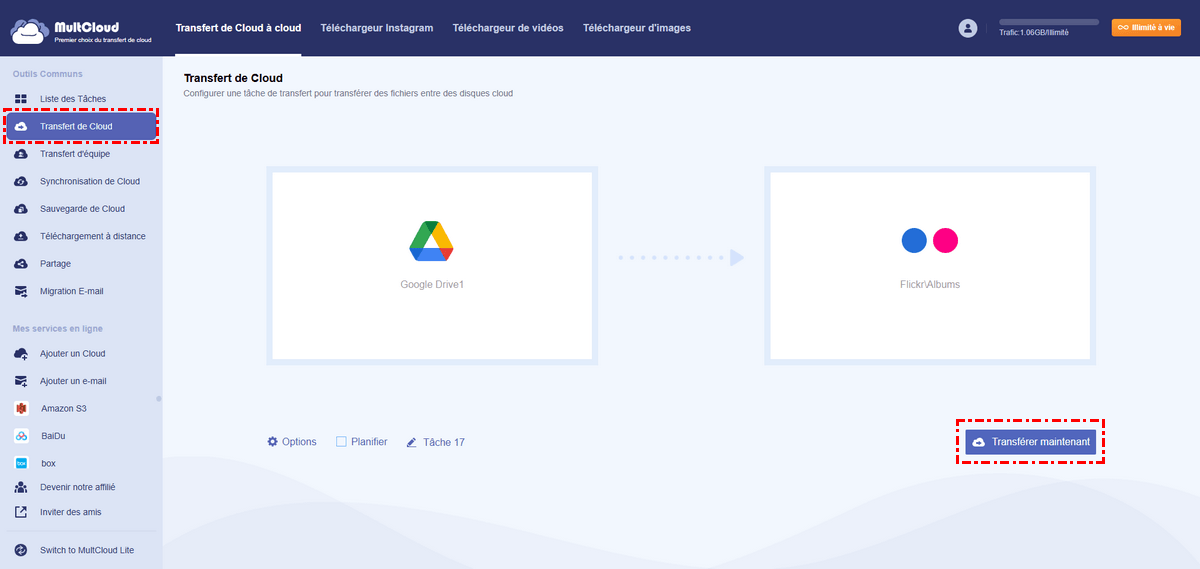Cliquez sur le bouton « Transférer maintenant » ci-dessous pour que MultCloud transfère immédiatement Google Drive vers Flickr. Vous pouvez également planifier une tâche pour qu'elle s'exécute ultérieurement.