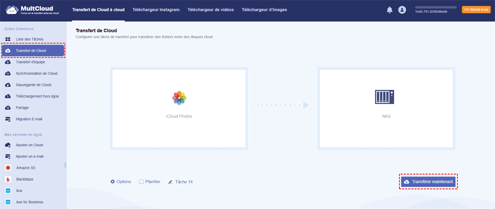 La fonction "Transfert de Cloud" fournie par MultCloud peut vous aider à effectuer rapidement la migration des données de Photos iCloud vers NAS, sans changement fréquent de compte ni étapes de configuration complexes.