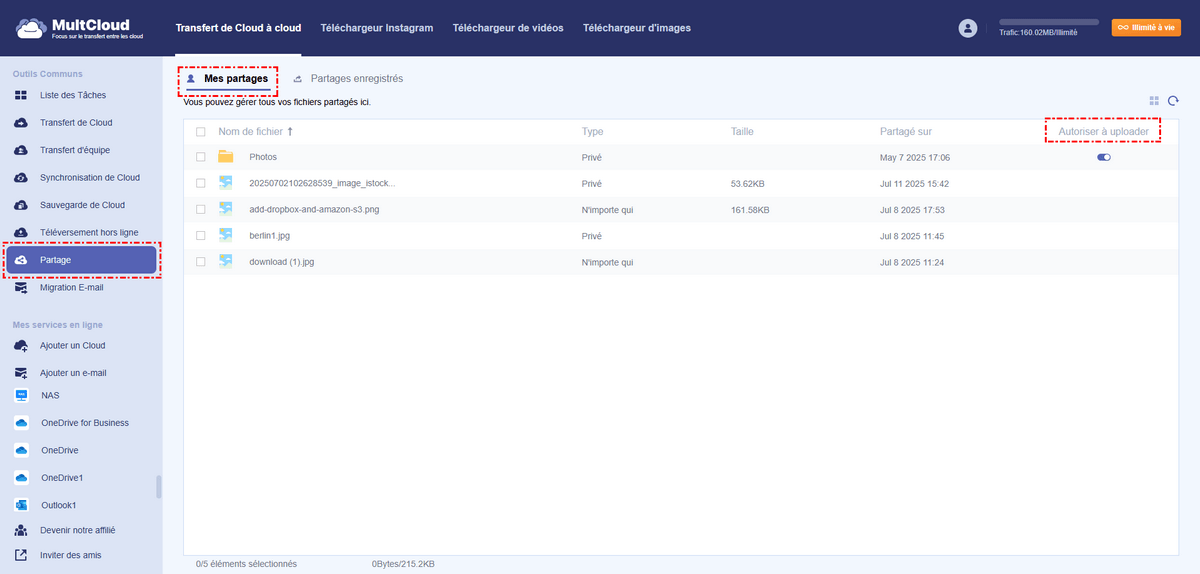 - Après avoir créé un lien de partage, vous pouvez consulter tous les contenus et types de partages sous « Partage » > « Mes partages » dans MultCloud.