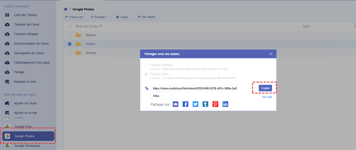 Étape 3. Ouvrez votre compte Google Photos dans MultCloud, sélectionnez les photos à partager, cliquez sur « Partager » > « Partager avec MultCloud », puis sélectionnez « Partage privé » pour la sécurité des données. Copiez ensuite le lien « Partage privé », puis envoyez-le avec le mot de passe à votre ami.