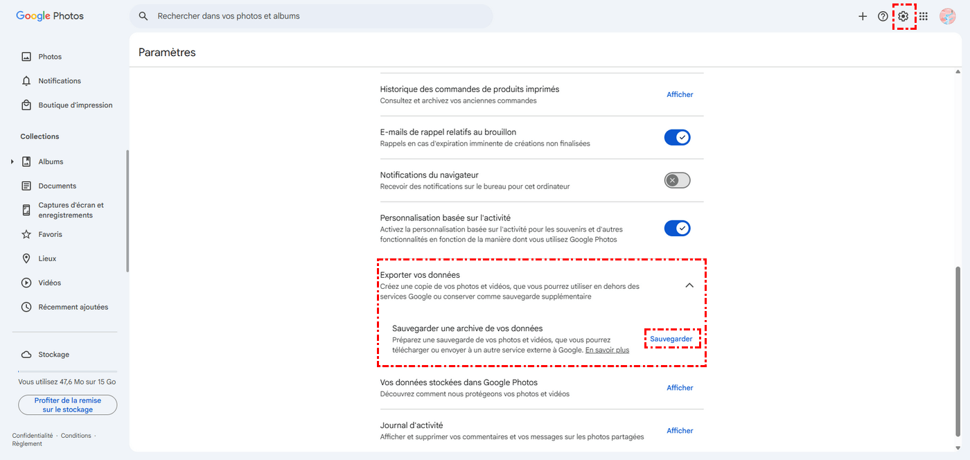Google Takeout peut gérer la migration des données entre les services Google et d'autres clouds, comme OneDrive, Dropbox, Box et Gmail, ou télécharger toutes les données d'un service Google sur votre ordinateur local. Vous pouvez ainsi sauvegarder manuellement Google Photos sur un autre compte.