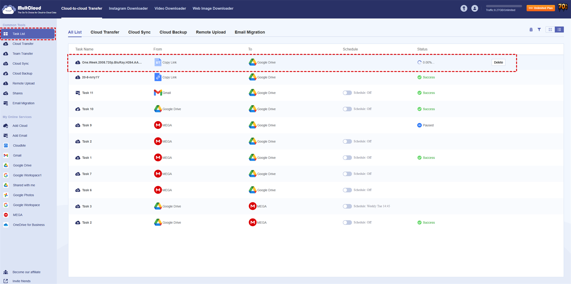 Step 5. You can check the the upload process and result in the Task List page. Or, if you don't want to upload, you can click "delete" to cancel the task.