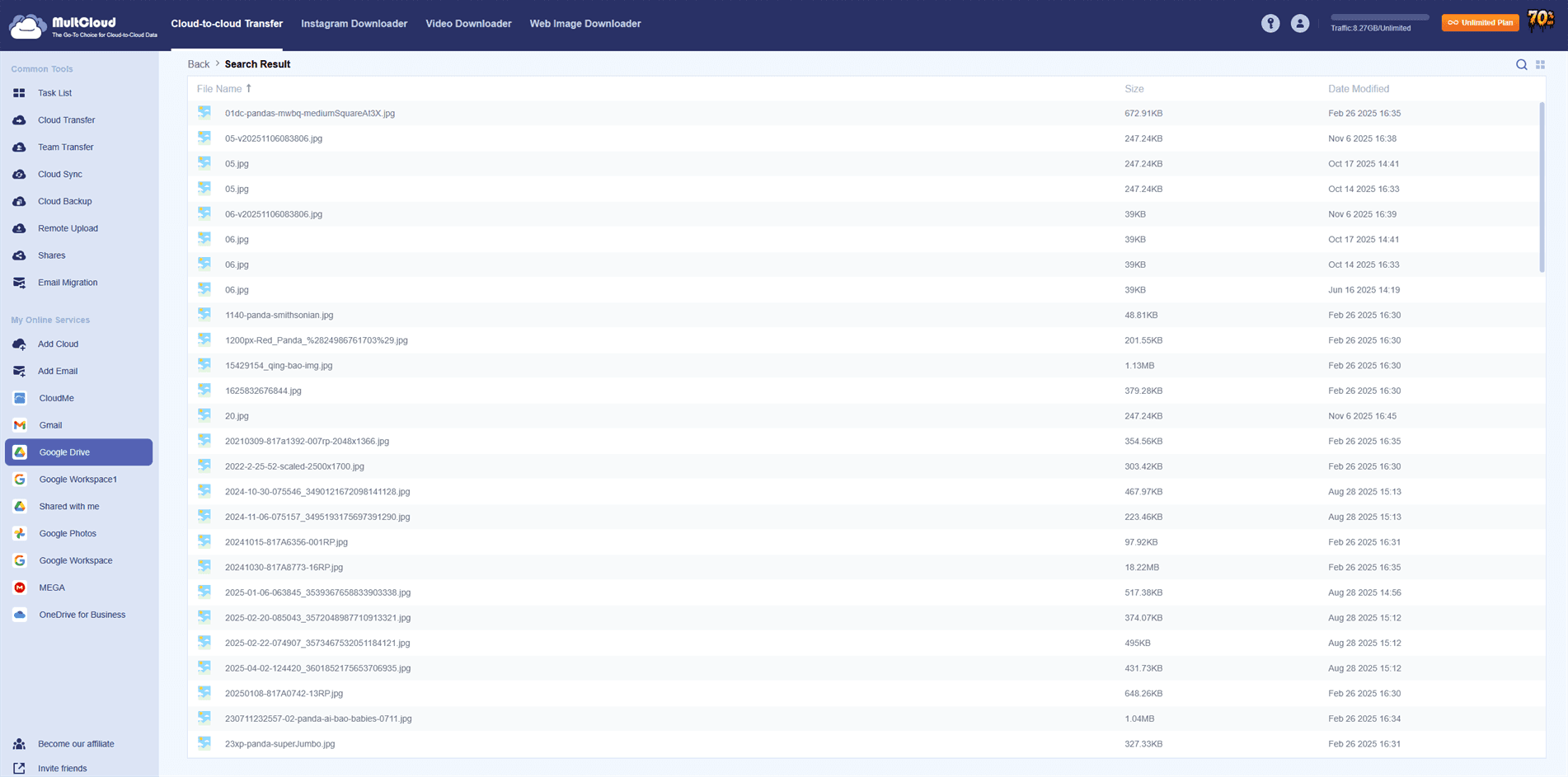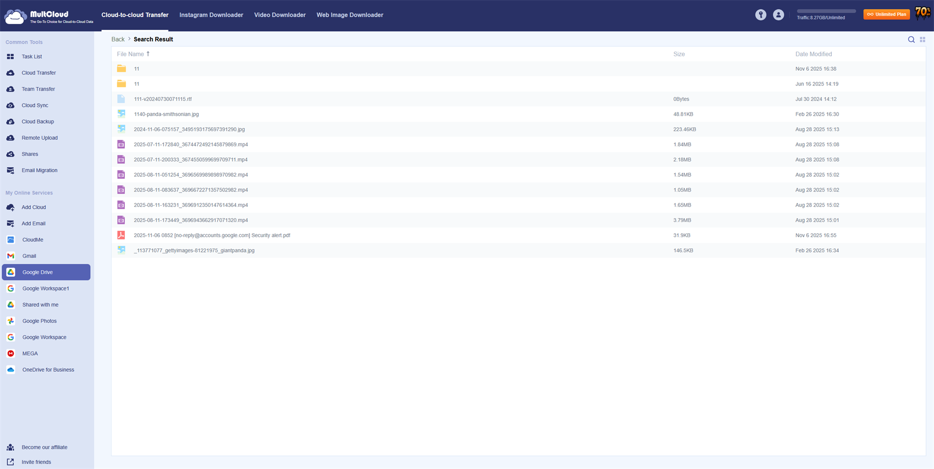 Get the result--files and folders that contain the keyword “11”. MultCloud also will show you their name, size, modified date and location.