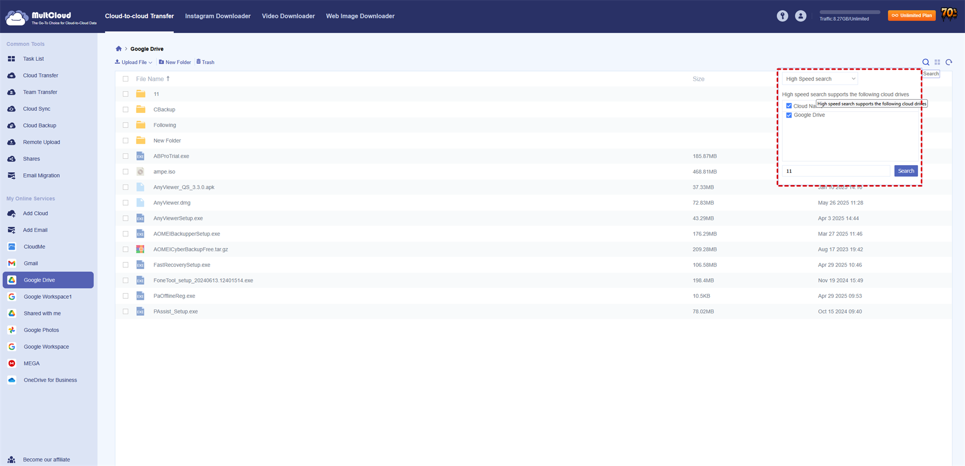 There is a quick search bar in MultCloud’s interface that helps the users to instantly locate a certain file among multiple cloud drives. Once a keyword is entered, MultCloud will immediately filter the related files throughout all the cloud drives. In this way, all the different cloud drives can be seen as a whole one.