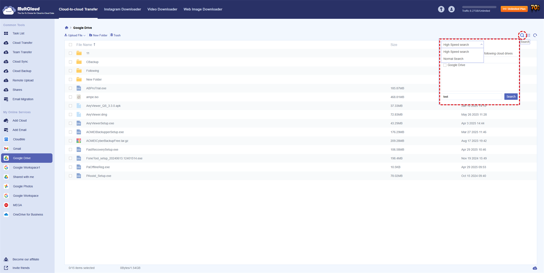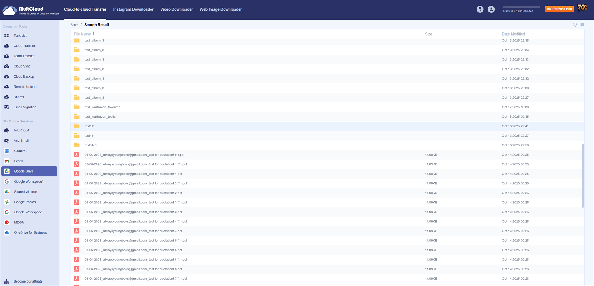 Get the result--files and folders that contain the keyword “test”. MultCloud also will show you their name, size, modified date and location.