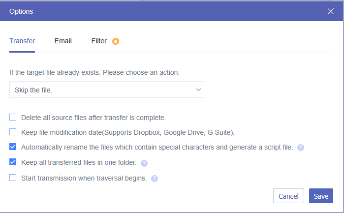 The "Automatically rename the files with special characters and generate a script file" option, if files in the source cloud drive have special character in filename that is not allowed in the target cloud drive, the files will be renamed automatically during the transfer process and a log.html file will be created in the root directory on target cloud drive.