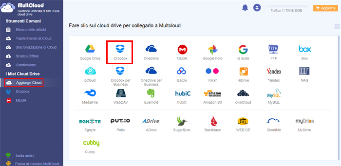 MultCloud supporta Dropbox, OwnCloud, WebDAV, Google Drive, MEGA, ecc., quasi 30 cloud drive. Questi cloud sono cloud storage popolari e sicuri che ottengono un gran numero di utenti in tutto il mondo.