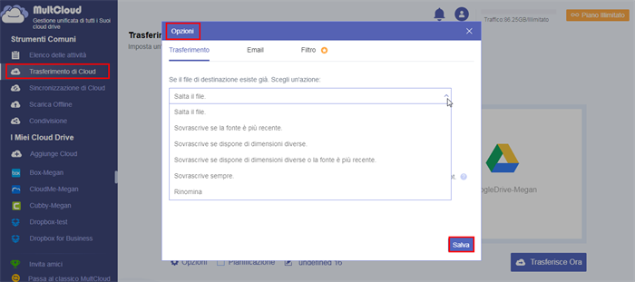 Fare clic sulla scheda "Trasferimento di Cloud" e selezionare i cloud che si desidera trasferire. Ad esempio, puoi copiare i file tra i servizi cloud come Dropbox e Google Drive in questa interfaccia. Fare clic su "Opzioni" e salvare la configurazione.