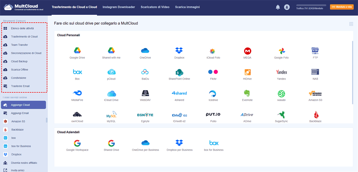 Senza dubbio, il modo più semplice per consolidare il cloud storage gratuito deve essere l'utilizzo di un gestore professionale di cloud storage multipli --- MultCloud. Puoi utilizzare il servizio basato su web per mettere tutti i tuoi account di cloud storage in un unico posto poiché MultCloud supporta più di 30 servizi cloud popolari, come Dropbox, Google Drive, OneDrive, iCloud Drive, iCloud Photos, persino NAS, WebDav, FTP/SFTP, Shared with me e Shared Drive.