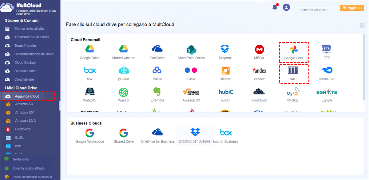 - MultCloud supporta oltre 30 cloud e servizi, tra cui Google Drive, Dropbox, OneDrive, OneDrive for Business, Dropbox for Business, Google Workspace, Box, Box for Business, iCloud Drive, iCloud Photos, MEGA, NAS, FTP/SFTP/FTPS, MediaFire, e altro ancora.