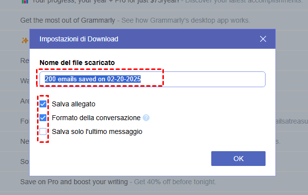 5. Seleziona Salva allegati e altre opzioni preferite, quindi clicca su OK per consentire a Gmail di scaricare tutti gli allegati dalle email selezionate.
