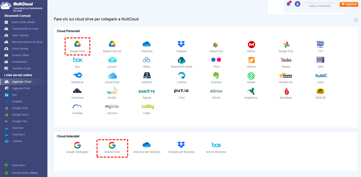 - In MultCloud, un account Google Workspace è diviso in My Drive (Google Workspace), Shared Drive e la cartella “Shared with me”. E un account Google Drive personale è diviso in My Drive (Google Drive) e la cartella “Shared with me”. Quindi, puoi aggiungere questi Drive rispettivamente a MultCloud per gestirli con un ordine migliore.