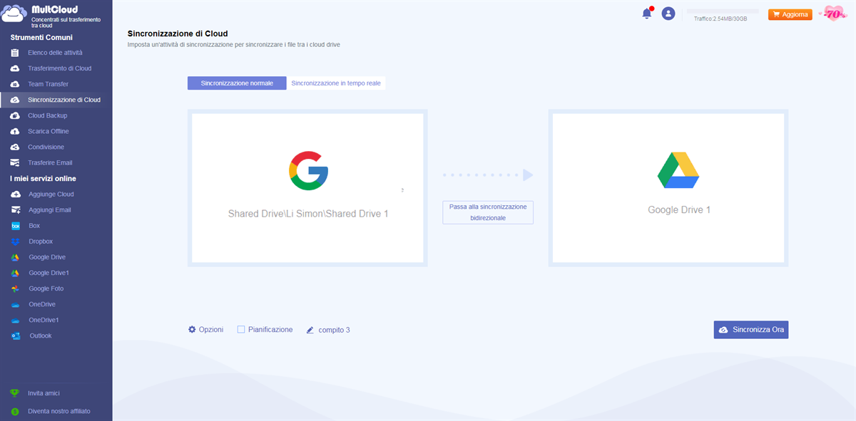 Per sincronizzare 2 account Google Drive e Shared Drives in modo più efficiente senza complicati passaggi, puoi provare un ottimo gestore di archiviazione cloud di terze parti chiamato MultCloud. È professionale nell'aiutarti a sincronizzare e trasferire dati tra più di 30 cloud, tra cui Google Drive, OneDrive, SharePoint, Dropbox, pCloud, MEGA, Flickr, ecc. contemporaneamente o come piano programmato gratuitamente in un'interfaccia ben progettata.