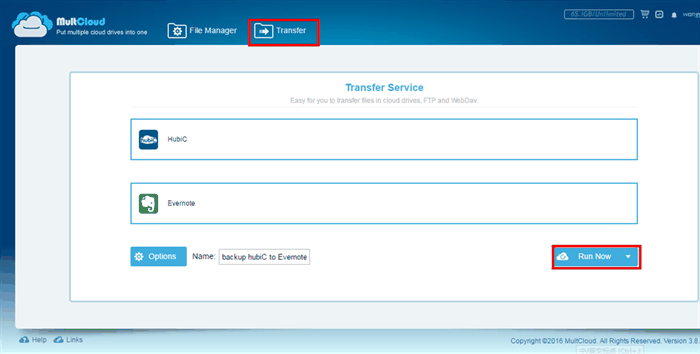 MultCloudはEvernoteにファイルをバックアップするのに役たつ無料のツールです。サインアップし、hubiCとEvernoteをMultCloudに追加するだけで、MultCloud内のすべてを自由に管理できるようになります。「Transfer」をクリックすることでhubiCからのスケジュールバックアップまたはhubiCへのスケジュールバックアップは実行されます 。