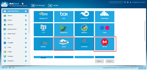 1.MEGAとhubiCを1つずつMultCloudに追加します。
