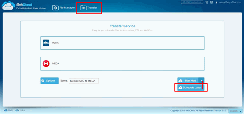 2.「Transfer」でhubiCをMEGAにバックアップし、「スケジュール」で自動実行を設定します。