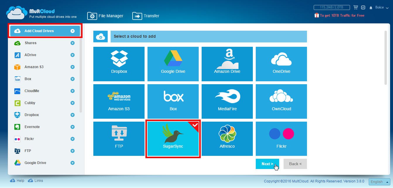 SugarSyncの複数のユーザーを同じコンピュータで同時に管理できる方法がありますか?勿論です!MultCloudを使用すると、ワンタイムログインだけで複数のSugarSyncアカウント間でファイルを簡単にコピーおよび移動できます。また、SugarSyncからDropboxやGoogleドライブなどのクラウドサービスにドキュメントを転送したり、バックアップしたりすることもできます(その逆もそうです)。では、使用中のアカウントを無料のWebアプリ - MultCloudに追加して上述の機能を楽しんでください。