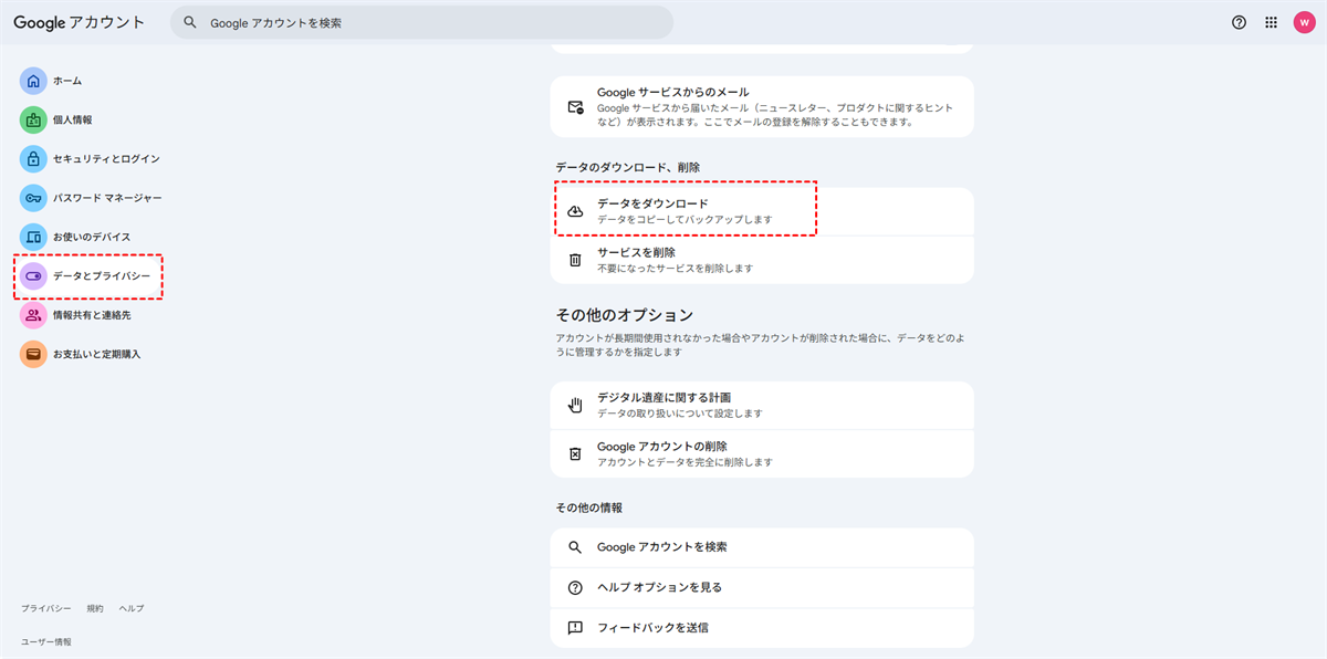 ステップ 2:「データとプライバシー」タブで、「データをダウンロード」をクリックしてGoogleデータエクスポートを開きます。