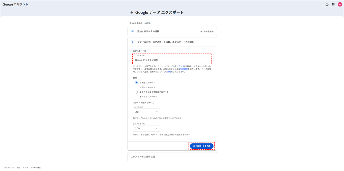 ステップ 4:保存先として「Googleドライブに追加」を選択し、その他の好みの設定を選択します。その後「エクスポートを作成」をクリックすると、GoogleデータエクスポートがGmailメールをGoogle Driveにバックアップします。
