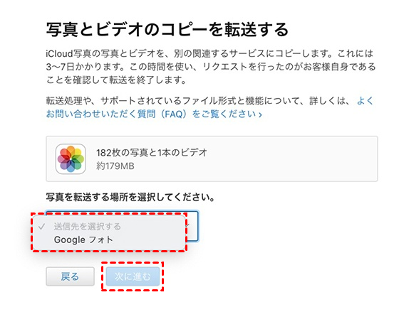 Googleフォト側に十分な空き容量が必要です。また、Apple IDの二要素認証を有効にする必要があります。大容量のデータを転送する場合は、完了まで数時間かかる場合があります。
