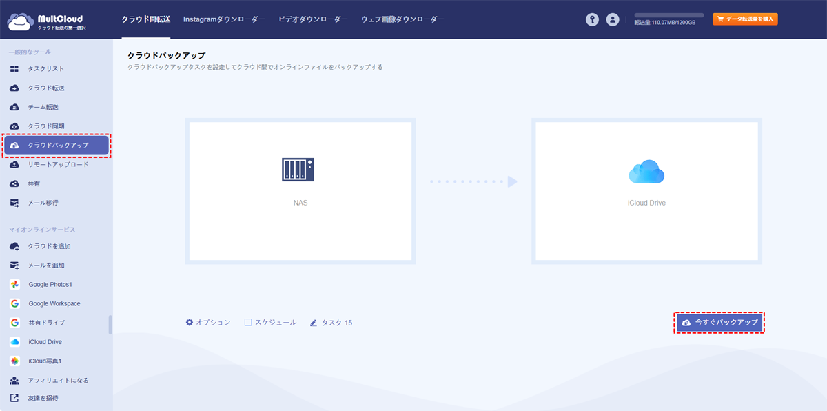 - シームレスなバックアップ:MultCloudの際立った特徴は、NASからiCloudへのシームレスなバックアップを実行できることです。小規模な家庭用NASセットアップから複雑な企業レベルのNASシステムまで、MultCloudはバックアッププロセスを効率的に処理できます。