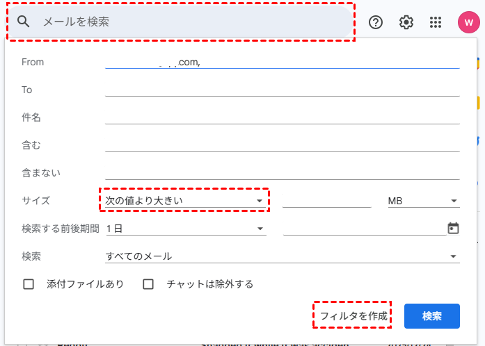 ステップ 4:「サイズ」ドロップダウンメニューの横のボックスに、希望するサイズ(例:10)を入力し、10MBより大きい添付ファイルがあるメールを検索します。ドロップダウンメニューで「MB」が選択されたままであることを確認してください。
