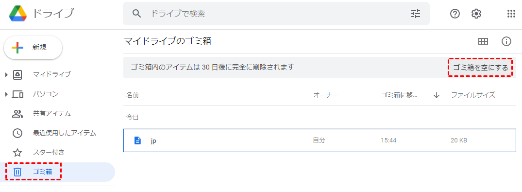 ステップ 2:Googleドライブページの左側にある「ゴミ箱」を見つけてクリックします。