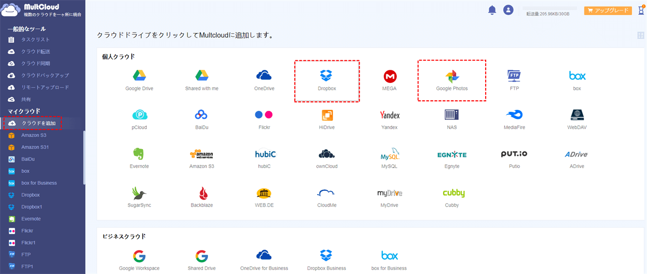 MultCloudを利用することで、写真をダウンロード・アップロードせずに、数回のクリックだけでGoogleフォトから別のクラウドにバックアップできます。ここでは、MultCloudを利用してGoogleフォトからDropboxへのバックアップを例として操作手順を紹介ます。