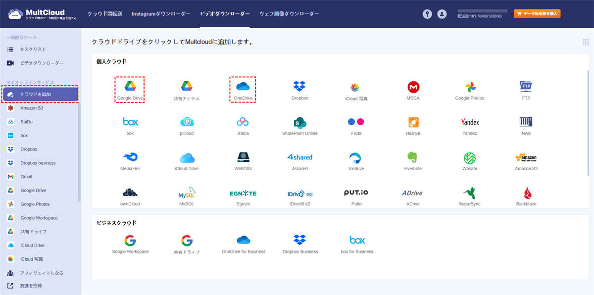 例をとして、MultCloudでOneDriveとGoogleドライブを同期する手順を紹介します。
