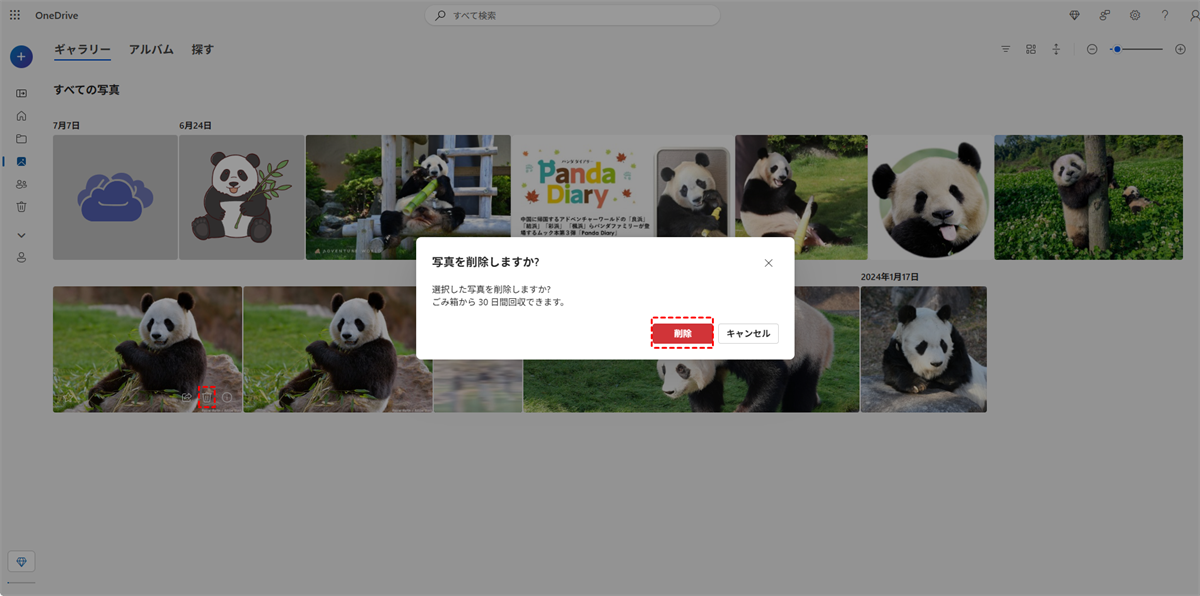 これでOneDriveウェブサイト上での手動削除は完了です。また、写真を一覧表示して目視確認し、直接削除する方法もあります。