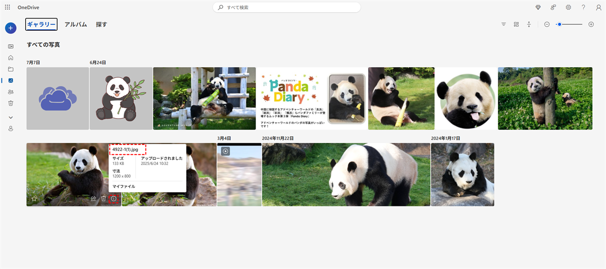 ステップ 2:上部メニューの「ギャラリー」をクリックし、「すべての写真」から写真にマウスを合わせます。(「i」マークの円アイコンにカーソルを合わせると、ファイル名・サイズ・アップロード日時・解像度・保存場所が表示されます)