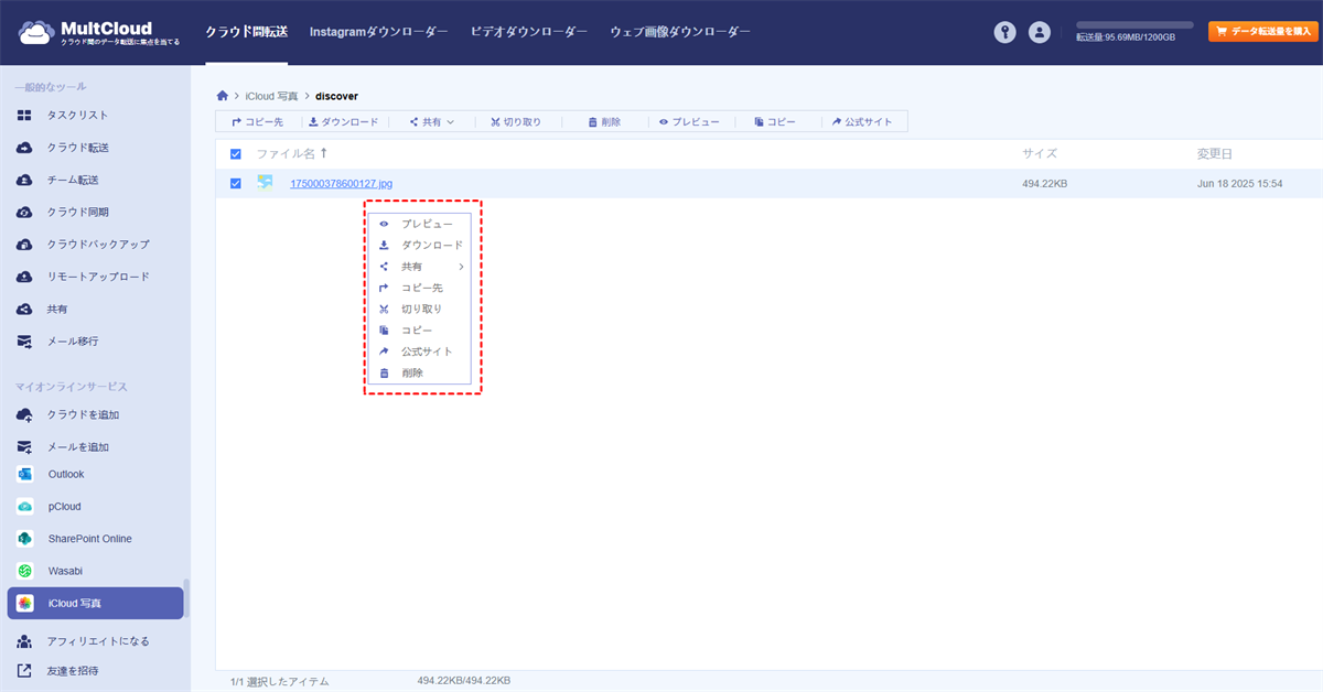 iCloud写真から個人データをダウンロードする場合でも、データを共有する場合でも、ユーザーは使用デバイスに応じて異なる操作手順が必要です。iCloudの標準ダウンロード機能でPCに写真を転送するのが面倒だと感じるなら、クラウドファイル管理ツール「MultCloud」を使ってiCloud写真データを一括ダウンロードする方法をお試しください。さらにMultCloudはiCloud写真を含む複数のクラウドアカウント追加をサポートしているため、管理が容易になり、iCloud写真からNASへの転送、またはFlickrやその他のクラウドストレージアカウントへの移行も簡単に行えます。