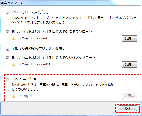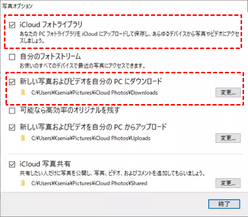 ステップ 3:「iCloud写真ライブラリ」にチェックを入れて、「新しい写真とビデオをPCにダウンロード」にもチェックを入れます。必要に応じて、ダウンロード先のフォルダをカスタマイズできます。設定後、「終了」>「適用」をクリックします。
