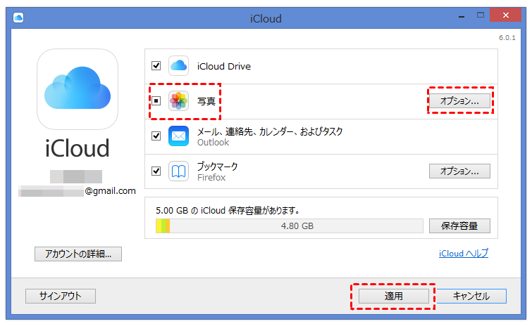 ステップ 1:PCでWindows用iCloudを開き、Apple IDでログインします。「写真」オプションが有効になっていることを確認し、「オプション」をクリックします。