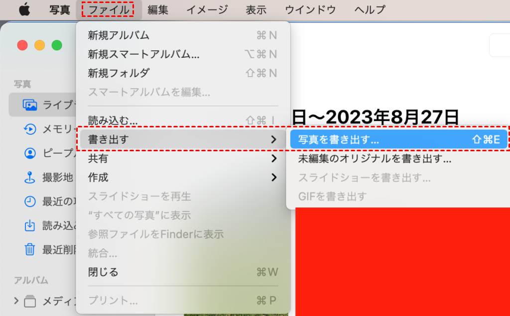 ステップ 2:写真を選択したら、「ファイル」>「書き出す」>「写真を書き出す」を選択します。