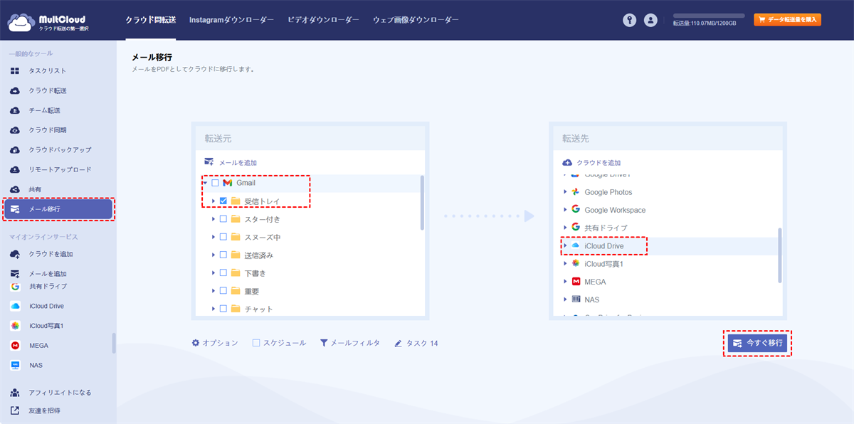 メールボックスに関しては、MultCloudを使用して、Gmailからメールをローカルのデスクトップに手間なくダウンロード、コピー、切り取りすることができます。同時に、GmailからiCloudへ直接、シームレスにメールを移行することも可能です。そのため、大きなメールをiCloudに保存する必要がある場合、MultCloudを使用して手間なくGmailのメールをiCloudに保存できます。手動の方法とは異なり、MultCloudはより直接的で労力がいりません。