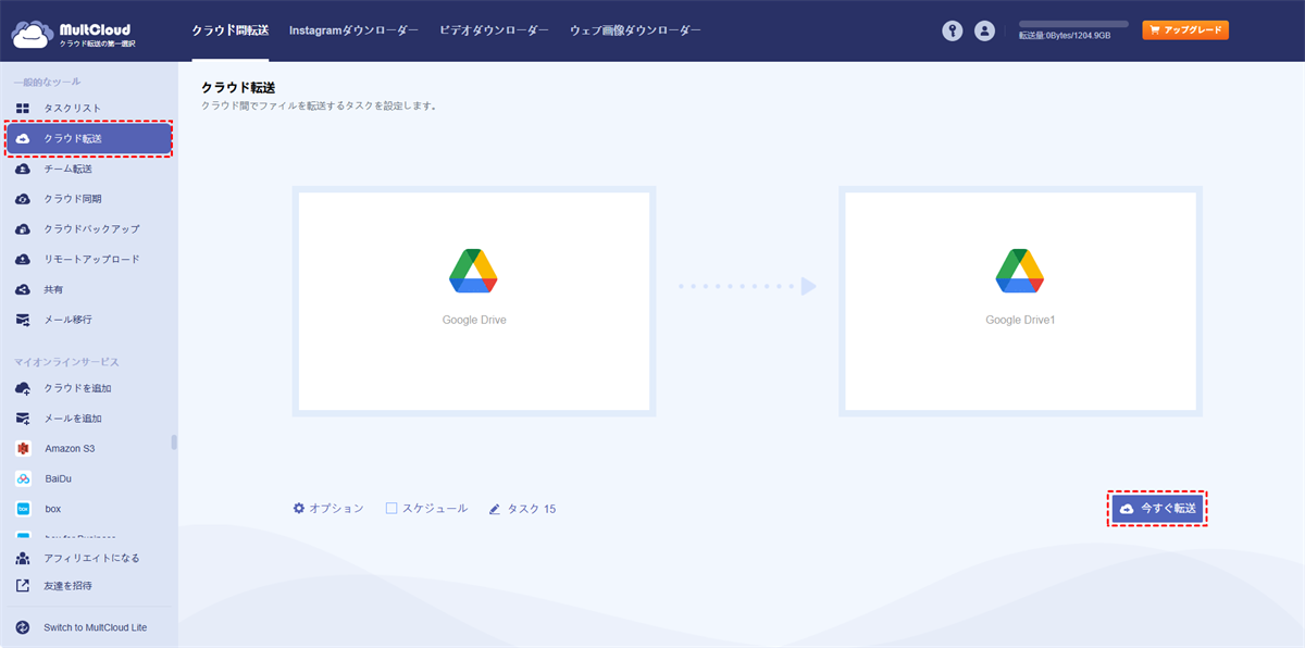 ステップ 3:左サイドバーのクラウド転送をクリックし、転送元としてGoogleドライブ1、転送先としてGoogleドライブ2を選択します。その後、今すぐ転送をクリックします。