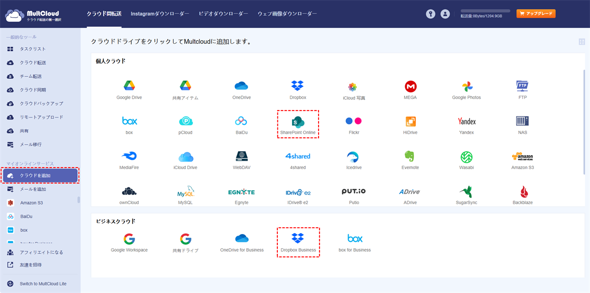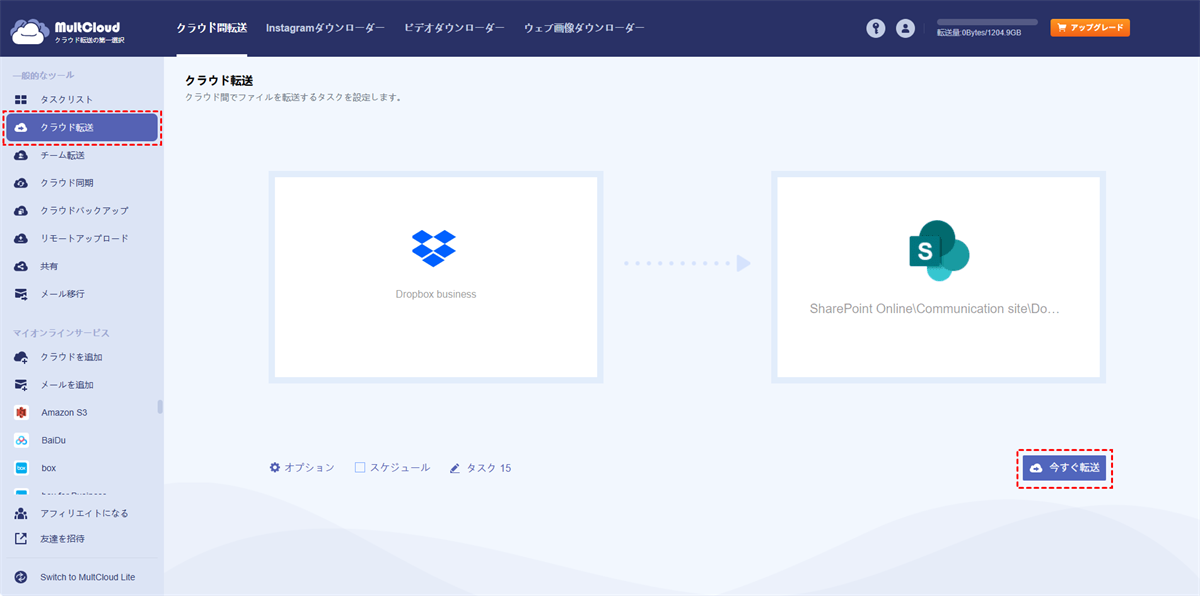 DropboxチームフォルダをSharePoint Onlineに自動で移行する方法をお探しなら、MultCloudのクラウド転送をお試しください。MultCloudは、Dropbox for BusinessとSharePoint Onlineアカウントを1つのウェブサイトでまとめて管理し、さまざまな強力な機能を提供します。個人またはチームフォルダをSharePointに移行するには、クラウド転送が必要です。