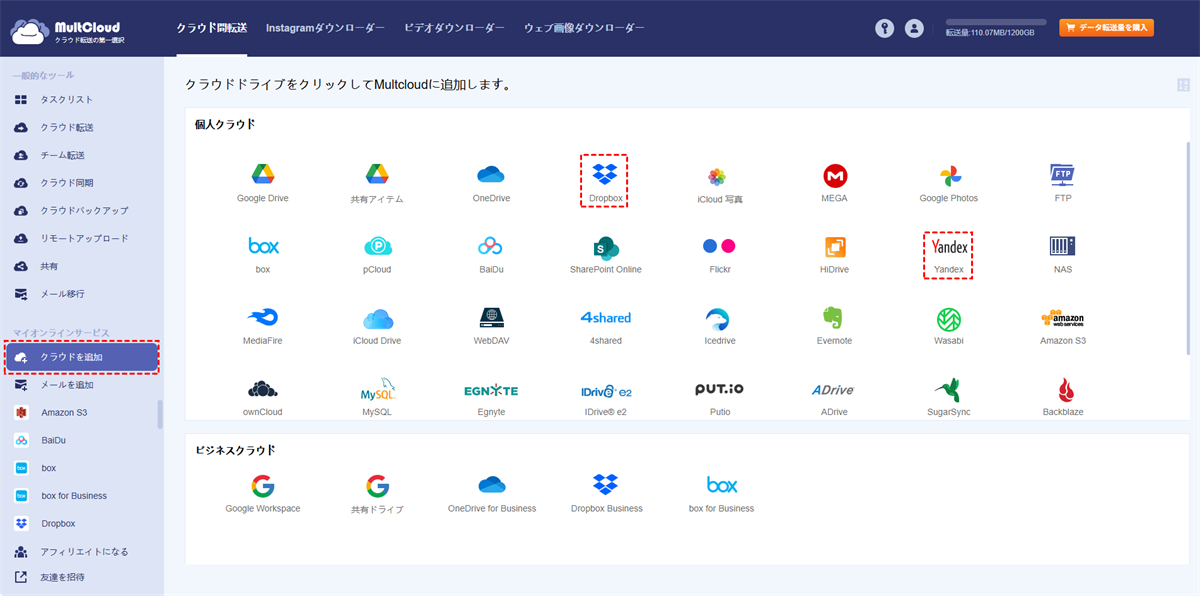 Dropboxの全データをYandex Diskに移行したい場合は、専門的なクラウド転送ツール「MultCloud」の使用をお勧めします。このクラウド管理ツールは、Googleドライブ、OneDrive、Dropbox、Yandex、MEGA、Googleフォト、iCloud Drive、iCloud写真、Gmailなど40以上の主要クラウドストレージをサポートしています。すべてのクラウドアカウントをMultCloudで一元的に管理することが可能です。