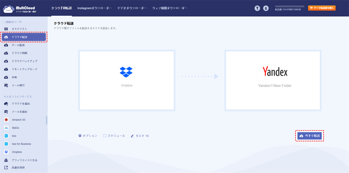 残念ながら、両サービス間で直接転送する機能はありません。DropboxからYandex.Diskにデータを移行するには、ダウンロードとアップロードを行う必要があるか、MultCloudを利用してDropboxのコンテンツをYandex.Diskに直接移行する方法があります。