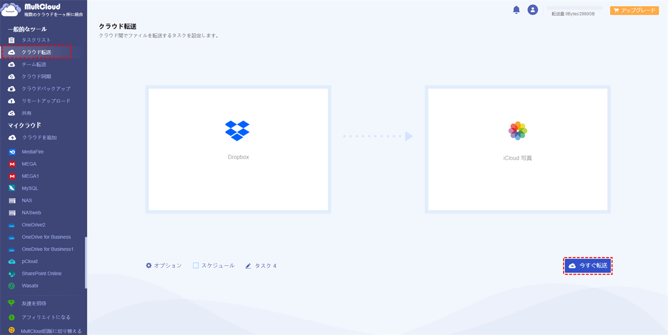 ステップ3:「クラウド転送」に進み、Dropboxを転送元として、iCloud写真を転送先として選択します。そして、「今すぐ転送」をクリックします。