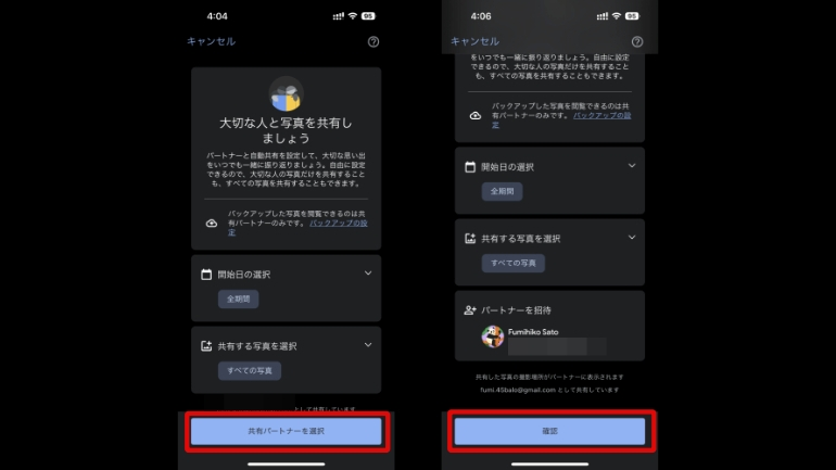 4. 招待を送信ボタンをクリックして再度共有し、パートナーのGoogleフォトアプリの招待通知を確認して承認します。