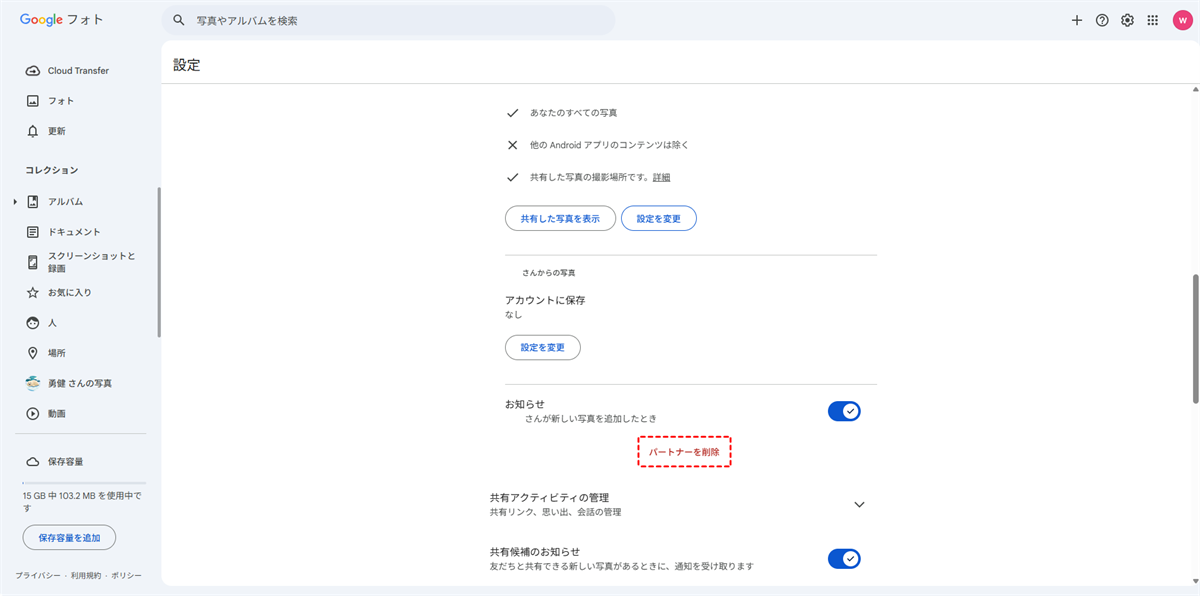 コンピューター上のGoogleフォトウェブサイトでパートナー共有を停止する