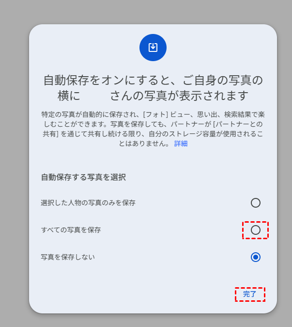4. すべての写真を保存にチェックを入れ、完了をクリックします。