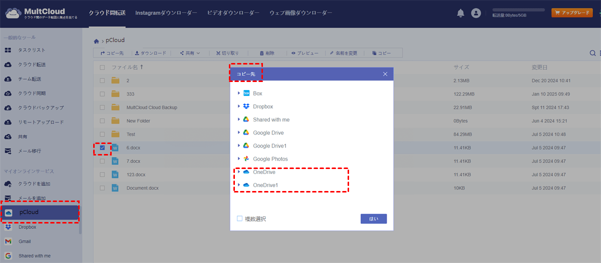 ステップ3: MultCloudでpCloudを開き、移動したいファイルを選択します。次に、上部の「コピー」をクリックします。
