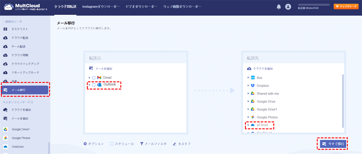ステップ2: 左側のサイドバーで「メール移行」を選択し、対応するボックスでOutlookとpCloudを選択します。その後、「今すぐ移行」をクリックしてこのタスクを開始します。