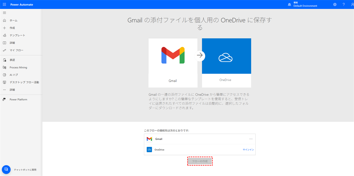 ステップ 2:Microsoftアカウントでサインイン後、GmailとOneDriveアカウントを接続し、「フローの作成」を選択して新しいフローを構築します。